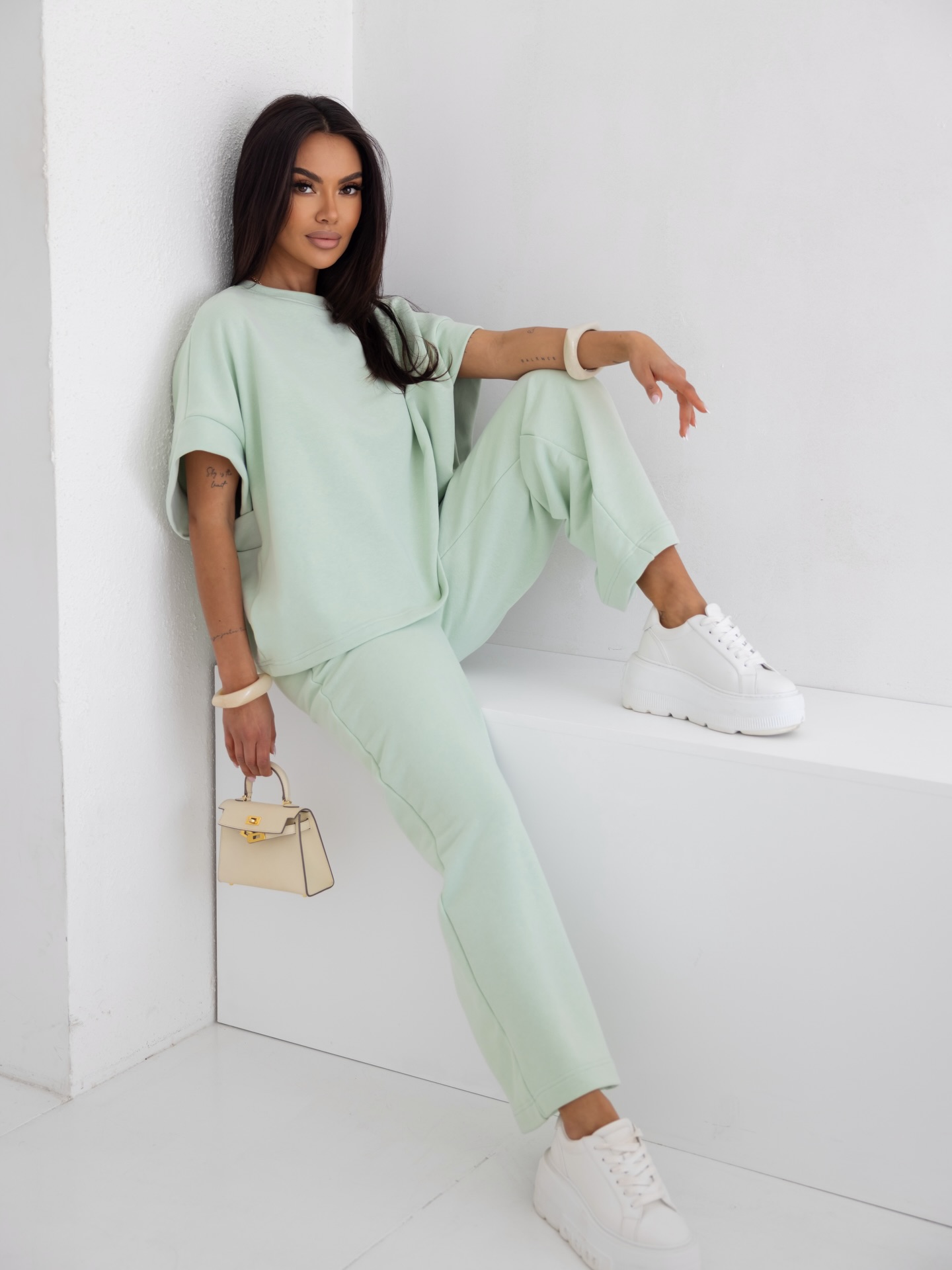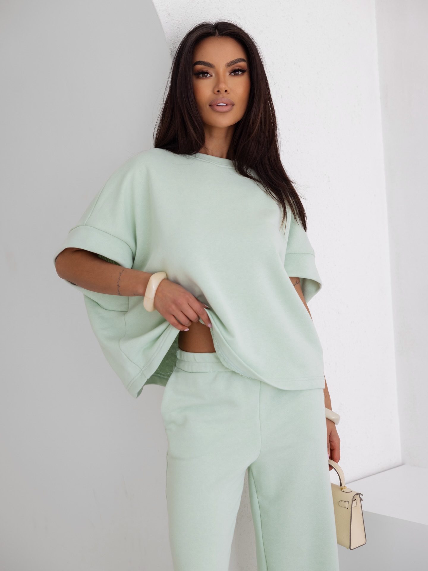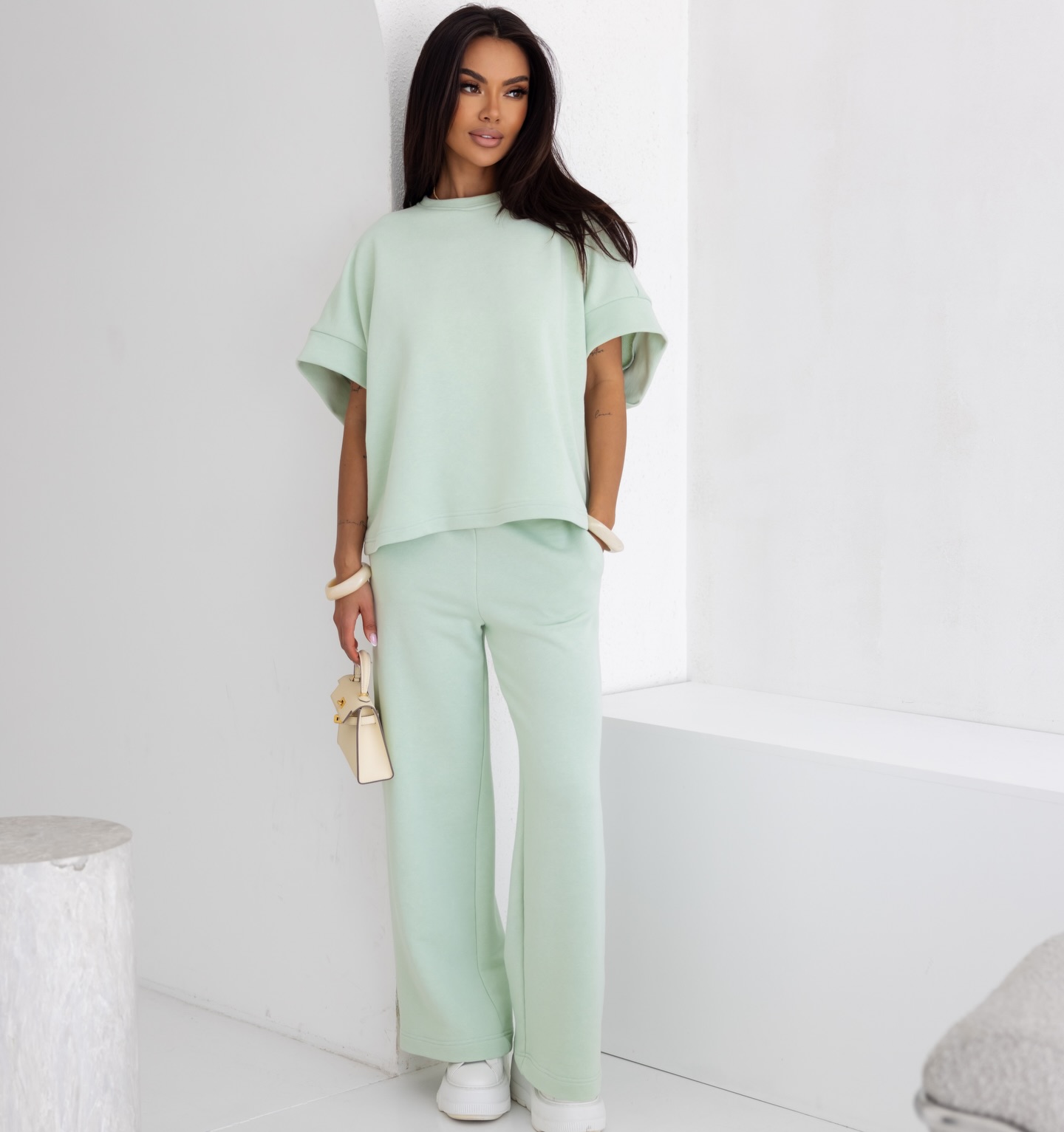 Stylowy komplet damski łączący wygodę i nowoczesny wygląd. W zestawie oversize’owa bluzka z krótkim rękawem oraz szerokie spodnie z luźną nogawką. Całość tworzy modny, minimalistyczny look. Wykonany z miękkiego, przyjemnego materiału, który zapewnia komfort przez cały dzień. Luźny krój dobrze układa się na sylwetce i wpisuje się w aktualne trendy. Idealny na co dzień, na wyjścia, zakupy czy spotkania. Pasuje do sneakersów, trampek i bardziej eleganckich dodatków.