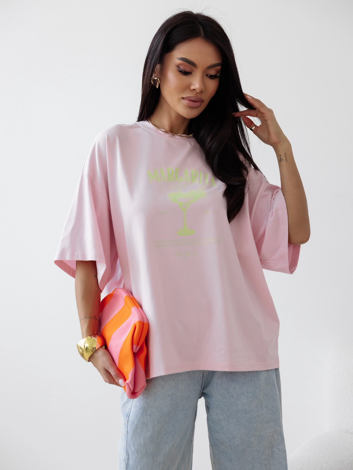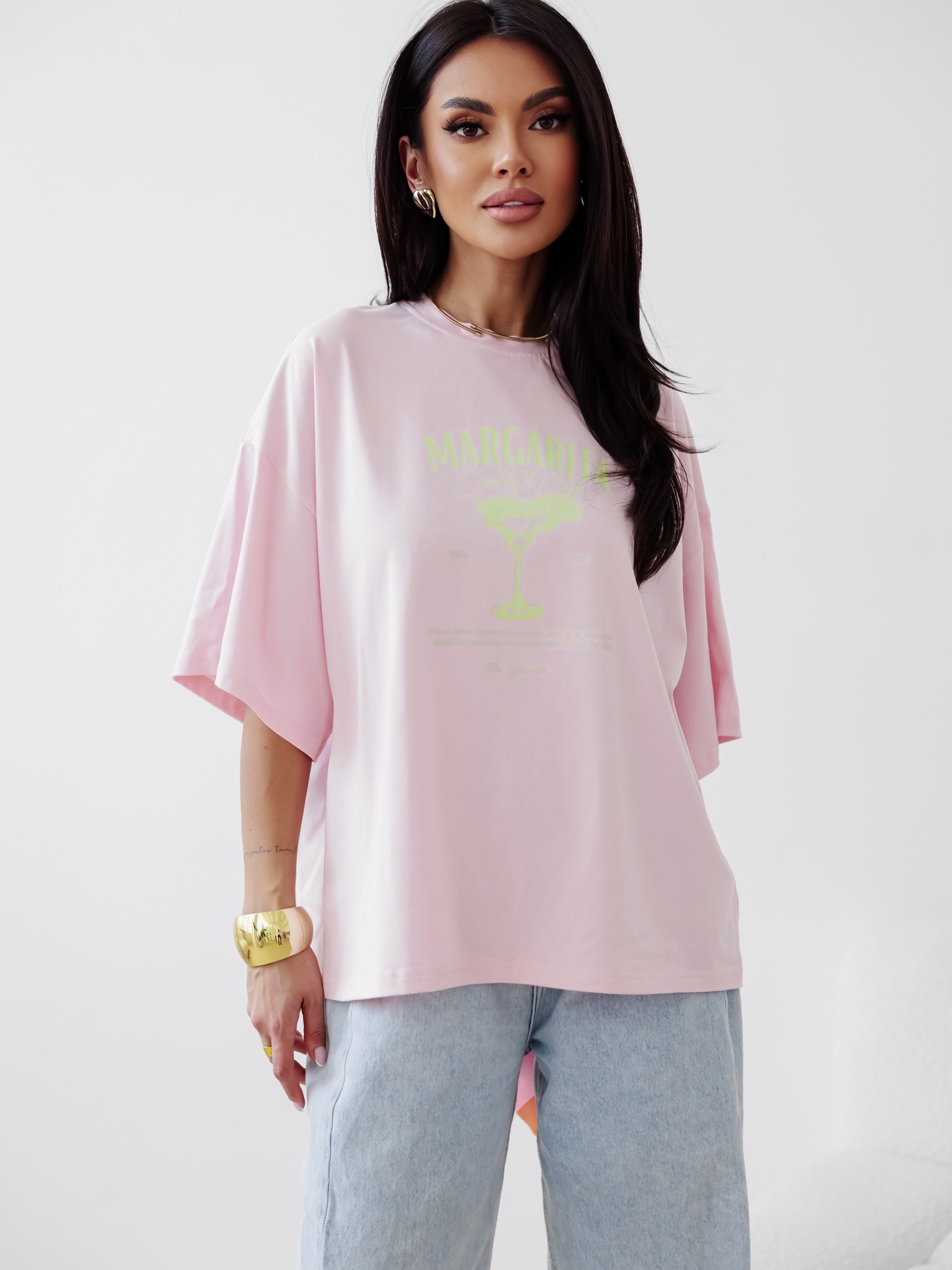 Oversize’owa koszulka z ozdobnym nadrukiem to coś więcej niż tylko basic. To ten element garderoby, po który sięgasz bez zastanowienia — kiedy chcesz czuć się swobodnie, ale wyglądać dobrze. Luźny krój otula ciało bez opinania, a miękki, przyjemny w dotyku materiał daje komfort, za którym się tęskni przez cały dzień. Nadruk przyciąga spojrzenia, ale nie krzyczy — dodaje charakteru i sprawia, że stylizacja robi się… kompletna. Załóż ją do legginsów, dresów, oversize’owej marynarki albo po prostu do ulubionych jeansów. To nie jest zwykły t-shirt. To Twoja codzienność w wersji stylowej.